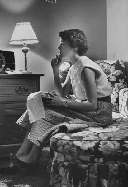 She brought the letter to the tablecloth under the lamp and… they all sat around the table thinking of last things to say while Ma wrote them down with her little red pen that had a mother of pearl handle shaped like a feather. When her neat, clear handwriting filled the paper she turned it and filled it again crosswise. -The Long Winter (Wilder)