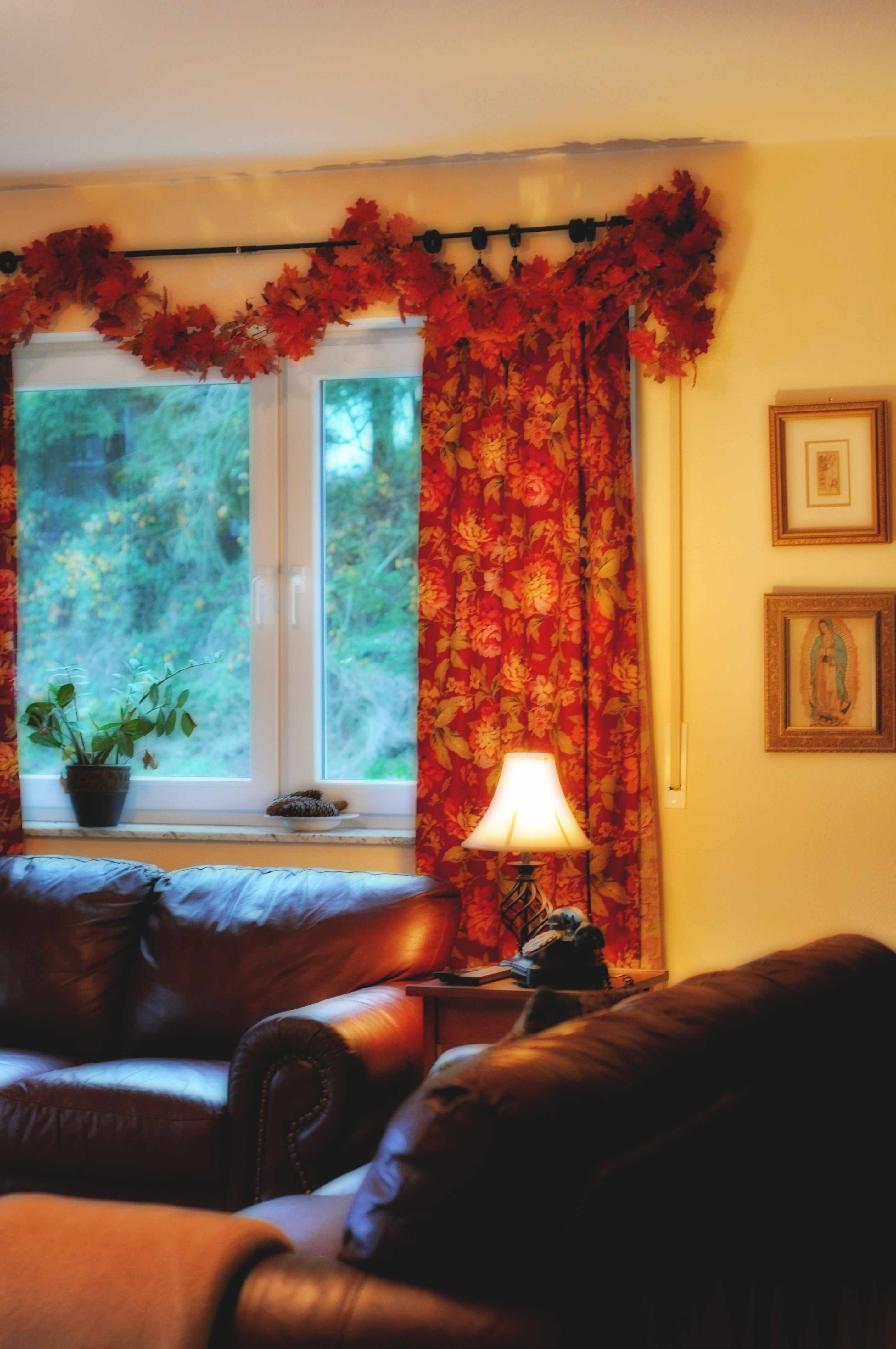 The old window scarf we were using for the living room was ok… for some other house, I finally decided. It gave the room a decidedly Tuscan feel, which this house definitely does not have. We have more of a farmhouse/granny chic thing goin' on. No use fighting it. In my fabric stash I had just enough yardage from a Joann's sale from years gone by to make two panels. Ridiculously easy. Two rectangles hemmed. Or stitch witched if you dont sew.