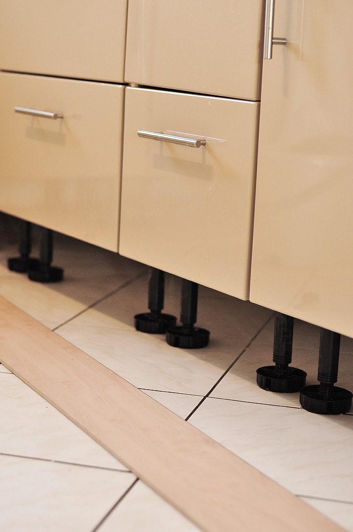 Our kitchen was built in.  Yet while cleaning the baseboards some time back I noticed they were actually clipped on. They are repositionable so you can pull them off to clean both them and under the cabinetry which isn't built in the way American cabinets are but rather are standing on these legs.  Just thought you might like to check that out.  And admittedly felt more than a bit virtuous cleaning not only my baseboards but UNDER my cabinets.  I felt sufficiently smug right until someone dropped the big whopper bottle of soy sauce the next day and it spilled where?  Yup. Under the baseboards.  But hey.  That baseboard popped right back off.  This is how God keeps me humble ; D