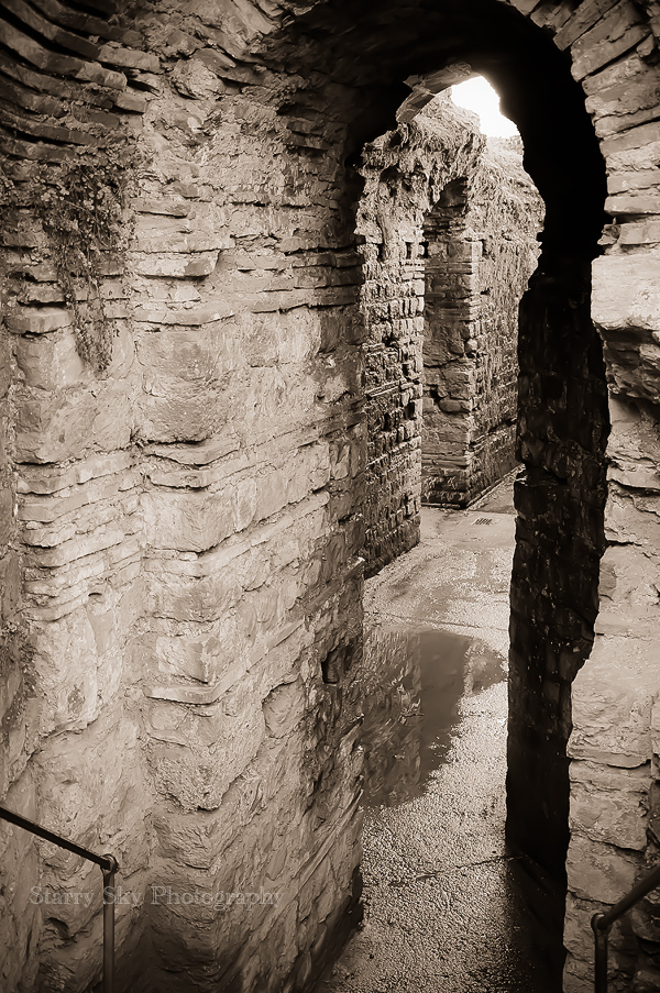 As we were wrapping up our visit we noticed steps. They really appeared to be just maintenance areas or something though. The boys wanted to check it out. They vanished down below and didn't return. After a while I told Colin I would go check it out. It was like slipping into Alice's rabbit hole. Just a short flight of steps down you entered a series of tunnels which connected various rooms throughout the entire grounds. There were openings in the roof periodically which lit the space.