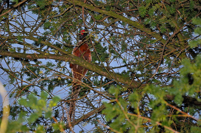 Summer daylight lingers long this far north, making it hard to convince children the day is done. This evening with no rain kept big and small outdoors while I was inside beginning to dress little people for bed. Their daddy came back to fetch them out again to show us what he and the boys had found in the tree outside the window, a beautiful ring-necked pheasant roosting just overhead.