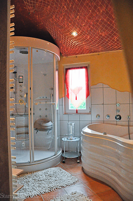 the shower has its own remote control. I swear it looks ready to beam you up. There are lights in the ceiling – blue and yellow flashing lights. Ceiling of the shower that is. Along with the radio.