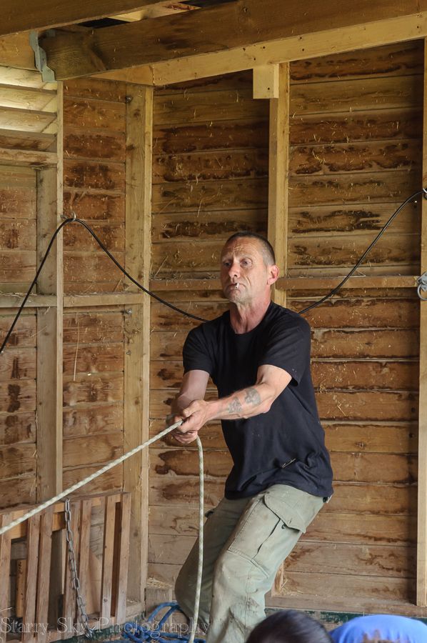 A team from New Zealand did the shearing the day we were there. They brought each animal in by catching it and maneuvering it into the shearing shed on three legs. Then it was carefully laid on its side, shackled to cables, and pulled still to prevent getting cut by the shears.