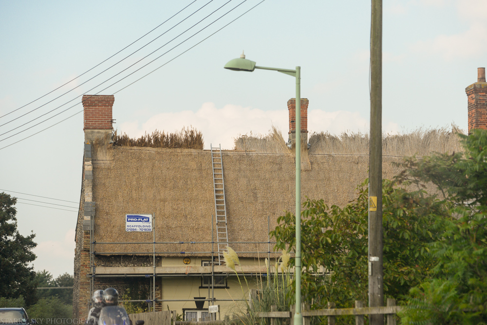 I have wanted to snag a picture of a local farmhouse which is being rethatched this summer. The house stands right alongside a busy road however so while we get a good look at it every time we drive by there is no good place to pull over. Problem solved when riding with my husband the other day. He even turned around so I could try again from another angle. You know, like hanging out of the vehicle. : )