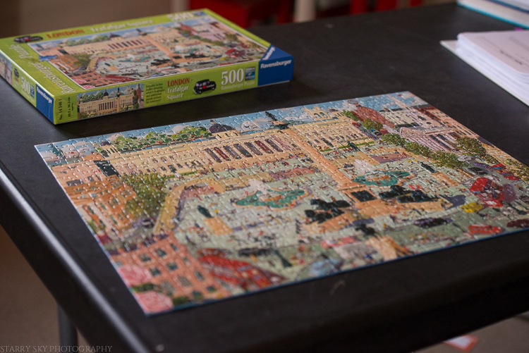 We sorted the games. Ditched a whole bunch with missing parts and pieces. Kieran was inspired to finish our new puzzle after this.