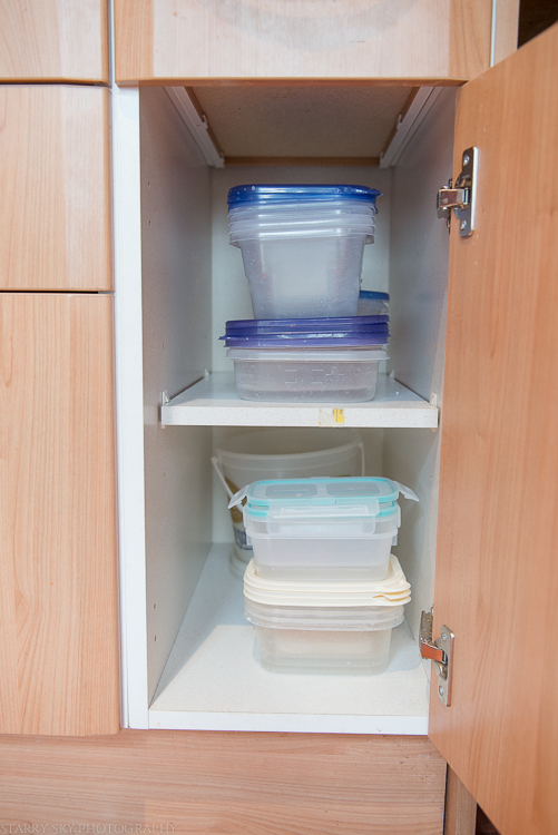 We tackled the tupperware cabinet one morning after it spilled out yet again. There isn't much left. I hope to get pyrex on the other end. Meantime, Mary Kay Clark's advice to use ziplock bags works fine.