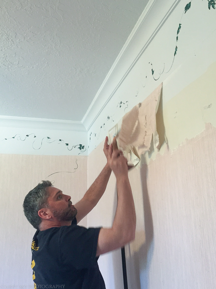 and the most awesome kitchen was next to the not awesome 90's wallpaper AND stencil job. The stencil from hell basically that climbed down onto wallpaper, over trim, and up onto the ceiling.