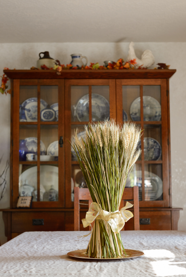 One thing I miss terribly about Europe is fresh flowers. They do have them here but they cost so much more to have on the table regularly. Since we really prefer natural, when I saw the bunches of wheat at Walmart I grabbed two ($4 each) thinking I would figure something out. This is what I figured out.