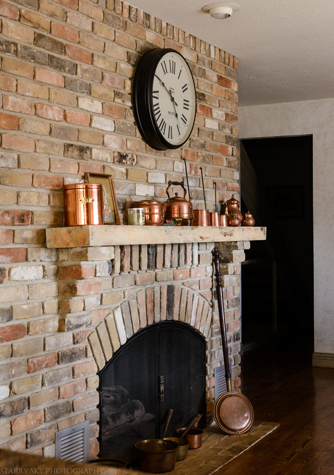 If you were here and looking left you'd see the fireplace wall. It was a major selling point for us. Major. I love this brick wall. Currently it holds my copper collection.
