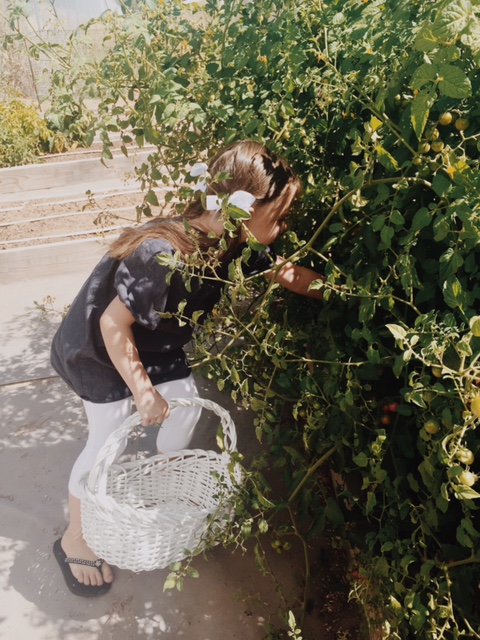 She also has a beautifully landscaped yard full of raised bed gardens which were overflowing. After we got Tess all settled she handed Abbie and I baskets and gave us the tour telling us to please thin out the veggies. This is pretty fabulous considering my garden now finally has exactly two tomatoes and three tiny rock hard green peppers. Not my forte. As in, if we had to live on what I could grow our little clan would have died of starvation long ago. BUT we have piano teacher/gardener extraordinaire now so we bag enough tomatoes to make a vat of salsa.
