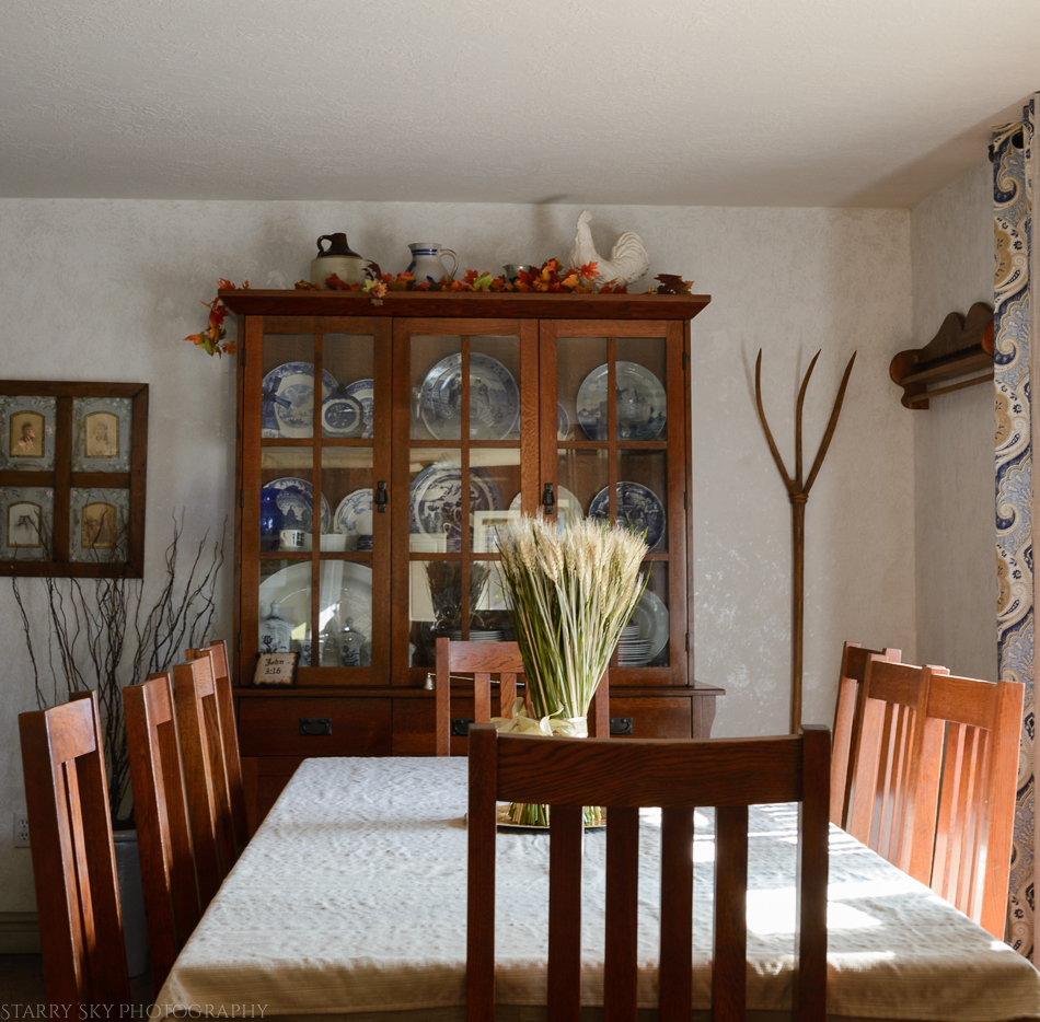The pullback below. The china cabinet is dressed in blue in this house. (staging shelves is not my strong suit) Top right is the delft plate I stuffed in my suitcase when I came back from the Netherlands as a student. The dining chairs are still covered in nasty old green upholstery. It's on the list of home improvement projects. Til then, cropped out. Voila. : D