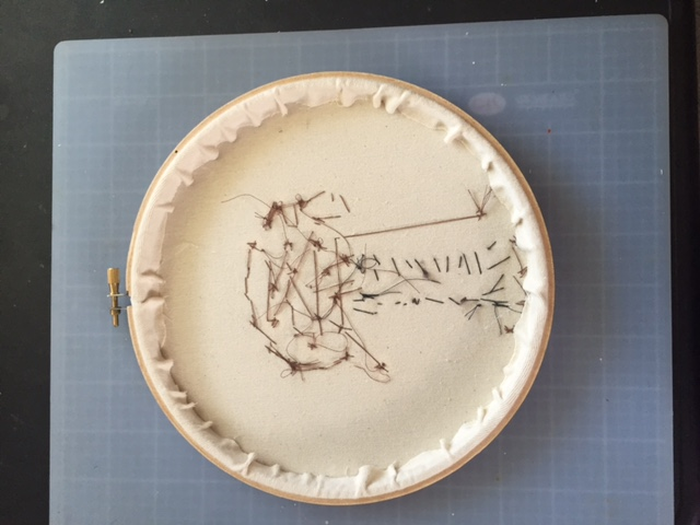 To finish we (the me part of we) trimmed and glued the fabric to the inner hoop. This is the same technique you use for framing patterned fabric or tea towels etc. with embroidery hoops.