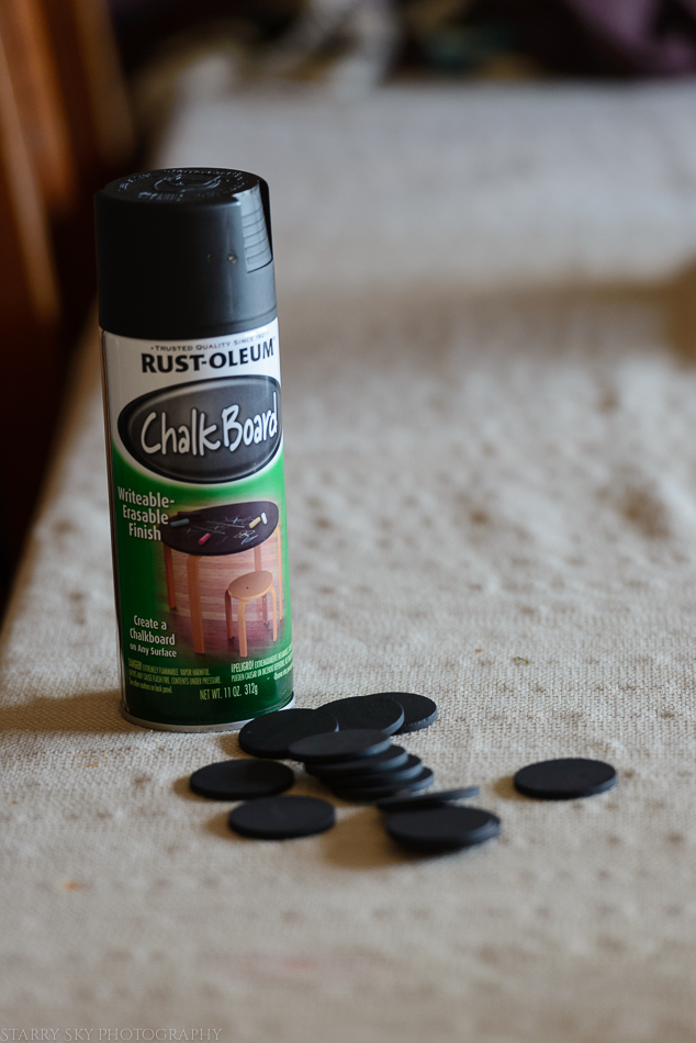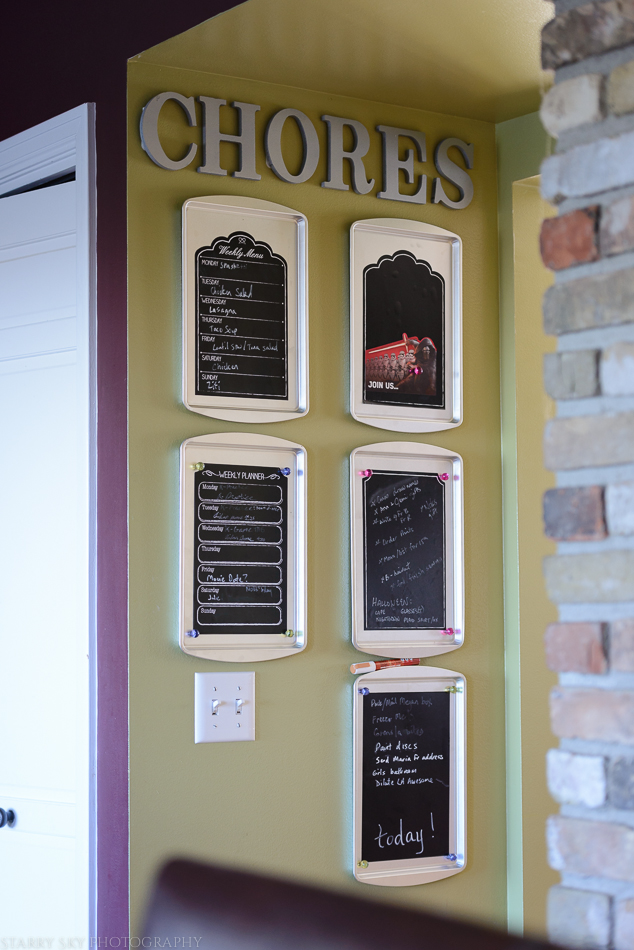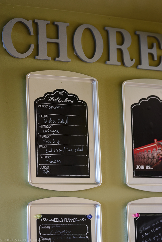 We bought a couple packs of plain wood discs and he painted those. I had putzed around on the computer making circle templates and typing the tasks out and then threw my hands up.  Couldn't pick colors (see above).   Then we were at Michael's  and found the pack of chalkboard sheets for less than $10 and it was settled. (I am sorry I can't find them online to link) Instead of trays for individual people we have topical boards – menu, appointments, to do, chores. We got chalkboard paint for the discs since I clearly have commitment issues. And love my chalk pen.  We put magnetic tape on the back of the discs so we can move them around the sheets.