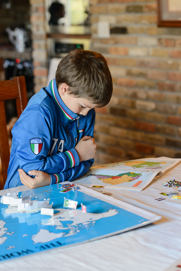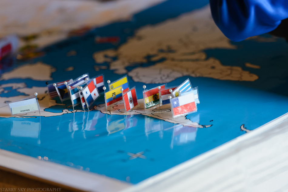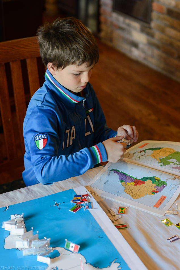 Third time's the charm.  We made the flag game today, a very not professional DIY Montessori flag work board set. It consists of a blank map poster glued onto foam board, a poster of world flags (to cut), a box of long pearl head straight pins, and packing tape.