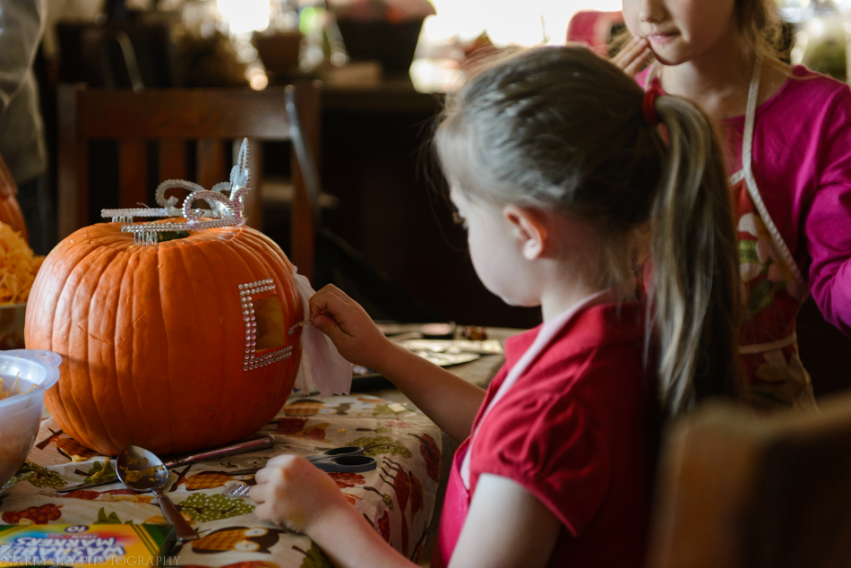 We have been plotting and planning pumpkin designs for weeks but, true to form, we began actually cleaning and carving the pumpkins way last minute.  And somehow misplaced the new carving kit.  But hey, they totally rocked the whole pumpkin thing thanks to neighbor helpers and big sisters who make last minute runs to get bling stickers and a tiny princess for this year's best in show.