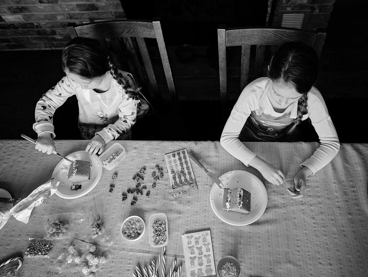 2) It is best to assemble the house foundation ahead of time and let it sit 'til the afternoon to decorate. By then the walls are securely fixed together. This all means less bad words to stifle. Major perk.