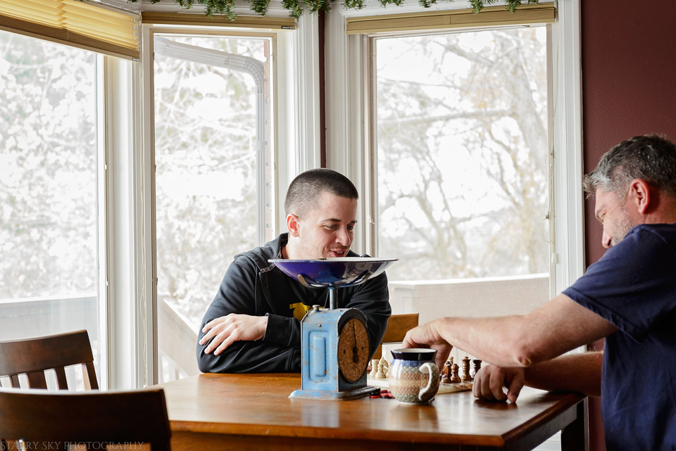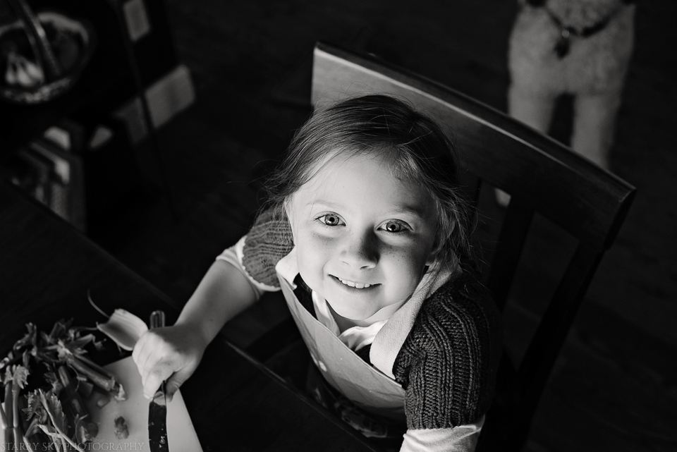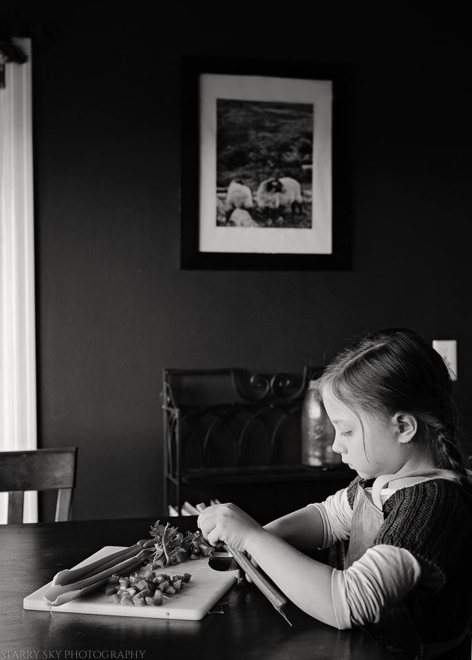 The littles wander in and out during these sessions. They always get an apron and kid-safe tools and find some way they can contribute. They stay as long as they like, Montessori style. They chop things into teeny pieces, hold bags open, grate cheese, beat eggs. This was one of those blissful moments.