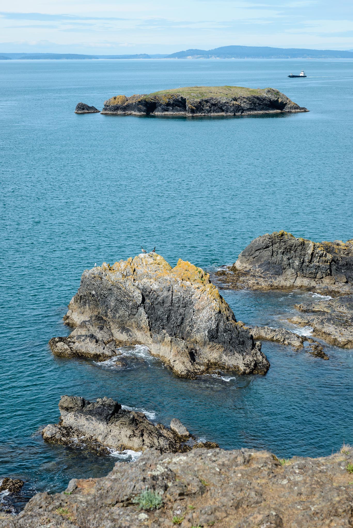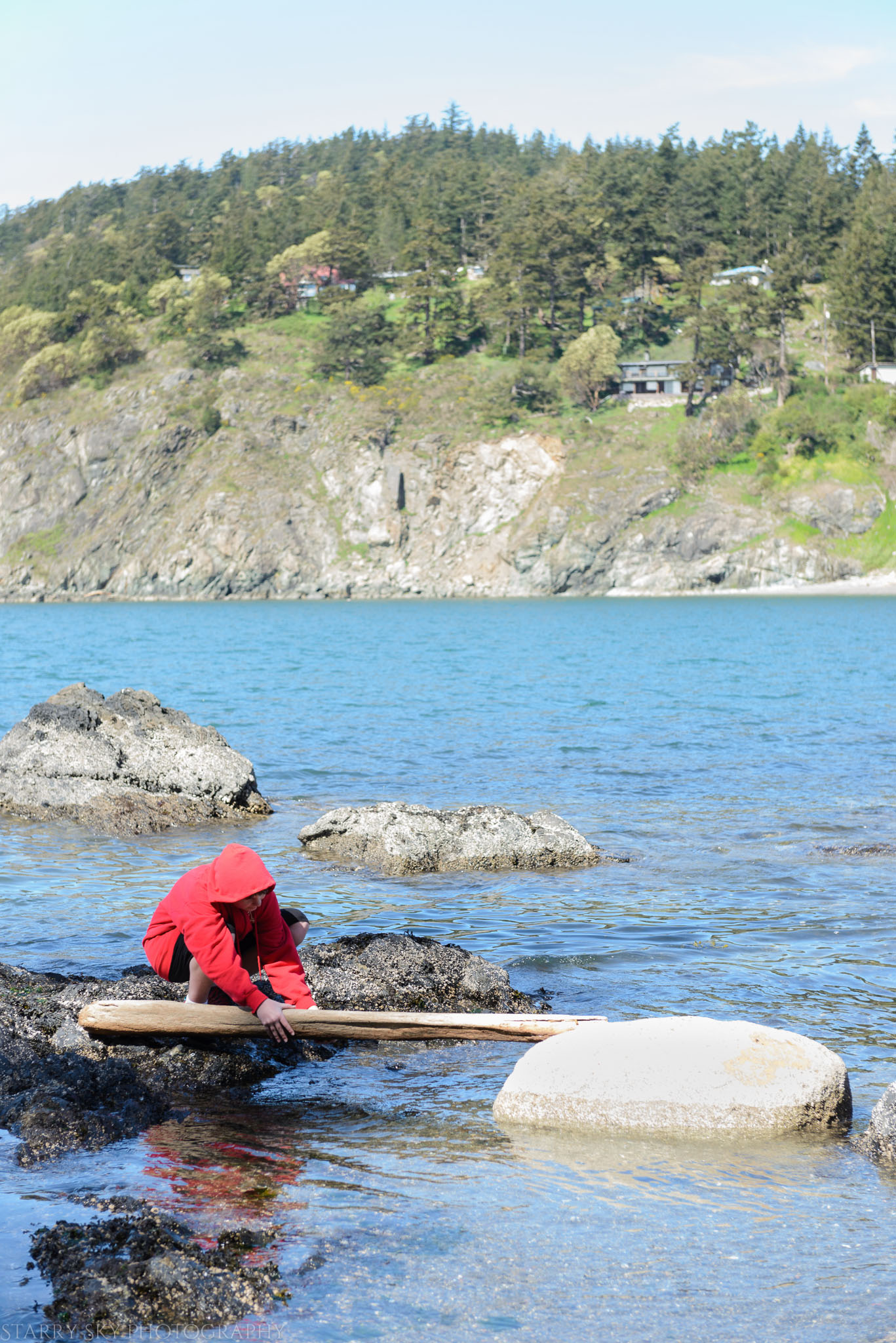 One of the beautiful places my friend Michelle took us when we visited the Pacific Northwest this year was Deception Pass. Joseph Whitby found the pass in 1792. George Vancouver dubbed it aptly since the sailors were duped initially, thinking the islands they were mapping were actually a long peninsula. Not so. The water was just shallow and the twists and turns of inlets tricky. On this beautiful morning they showed off a range of spectacular blues as our crew explored the tide pools.