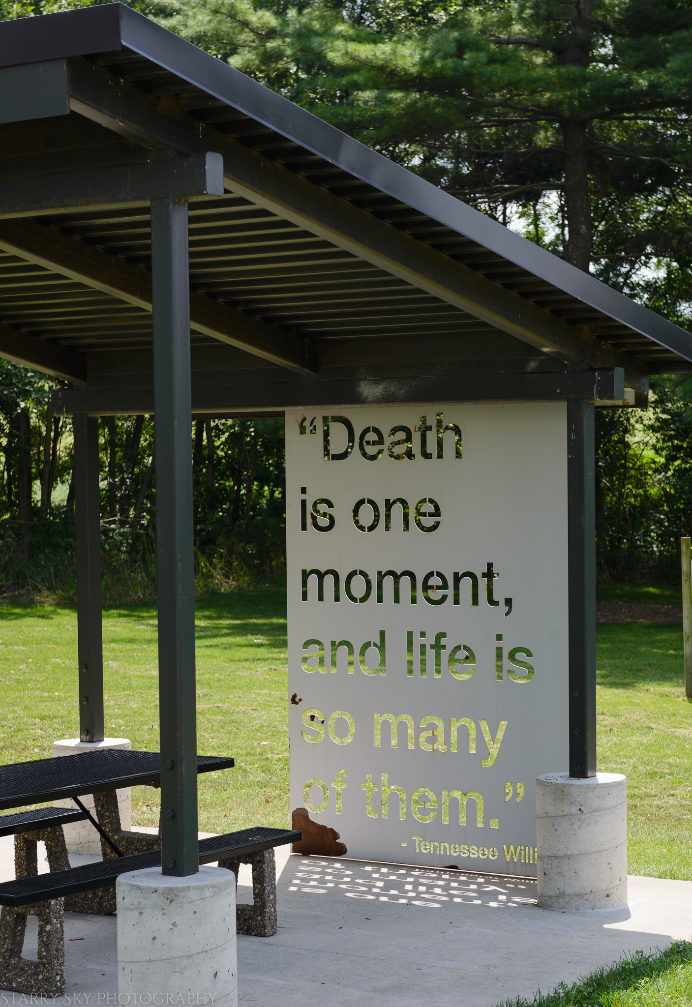 The closer we got the more evident it was that this was no ordinary, utilitarian rest area. Each little pavilion housed a picnic table and was framed with a cut-out quote. All of them? I quickly scanned the park area. Yes! Once I figured that out you know we would have to check out every.single.one. And we did, because I am a quote freak.