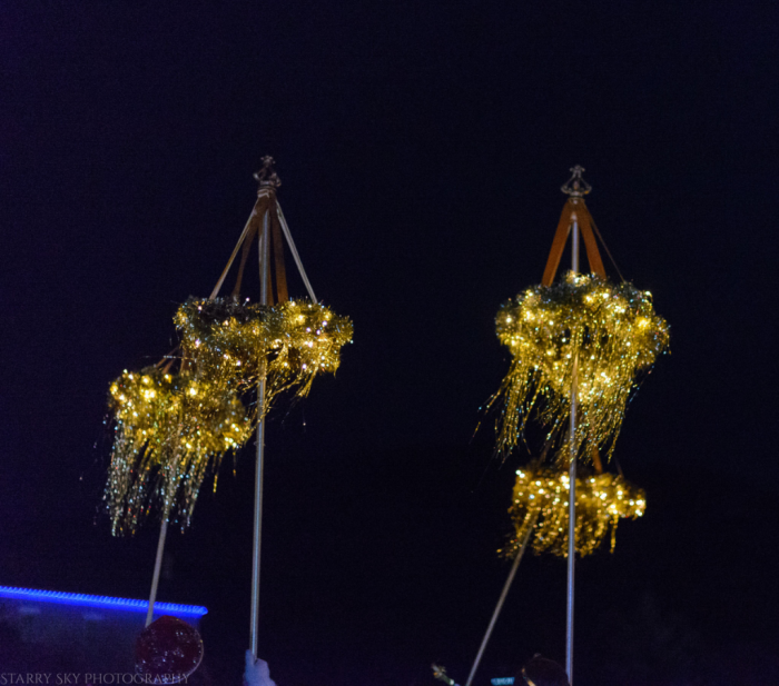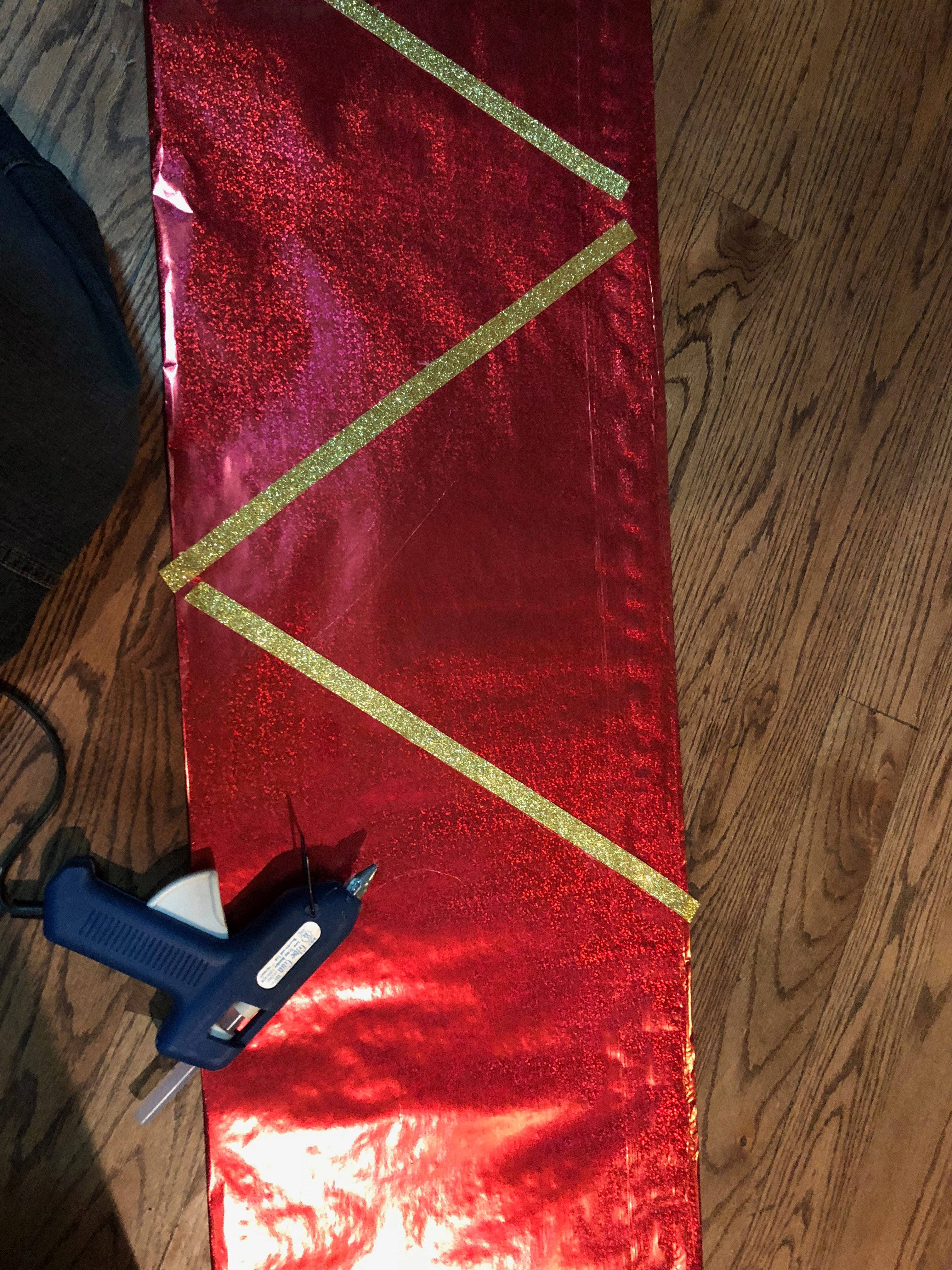 We covered the resulting long strip of poster board with wrapping paper. Fabric would have been nicer and sturdier, no doubt. We were aiming for speed and cheap and have no toddlers at the moment. Next, I glued gold ribbon.
