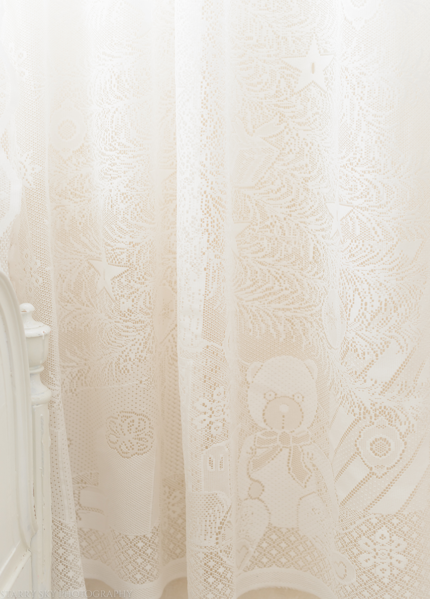 In true Austin Family fashion we complete approximately one bit of holiday preparation each day. Today we hung wreaths in the front windows. True to our family fashion, I keep finding one of them on the carpet. Darn generic command hook. Another day we replaced the girls' curtains with a hand-me-down holiday lace set. I love seeing the sunlight shine through the little stars and toys in the mornings.