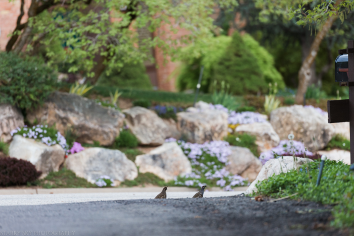 The pull of the deck on these pleasant, warm evenings is irresistible. We eat outdoors often and linger long. When dishes are finish we wander back to the yard. Respiration deepens, pulses slow. During one such evening we heard a distant call echo up from the woods. It was not the peacocks down at the farm below us. The sound grew louder and more furtive until out burst a little quail in quite a state, calling and calling and rushing to and fro. The Audubon Society describes the call as haunting. (link here) It did indeed bewitch me enough to follow it around the house til the cries stopped. Once reunited they happily and quietly walked off.