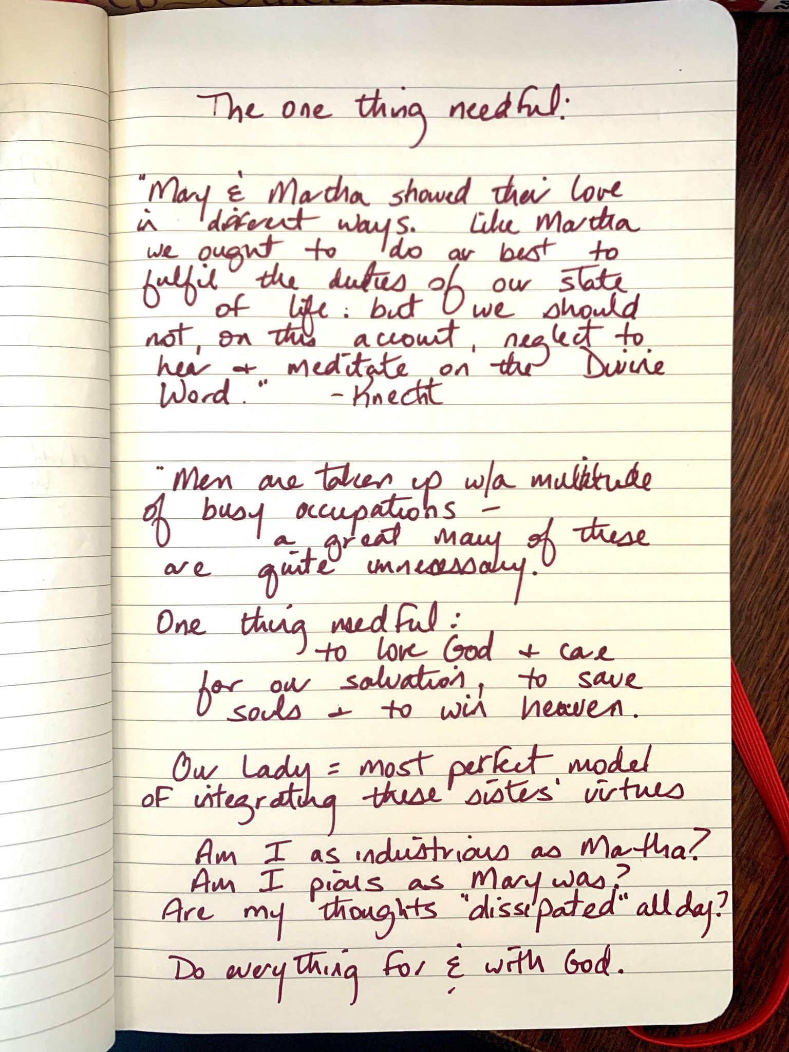 Tess read the story of Martha and Mary for bible study this week.  I try to base my own reading and journaling around what the children are studying, both to be efficient with my time and to help them flesh out what they are learning. Knecht's Practical Commentary on Holy Scripture has been such a treasure in this regard.  So wonderful! The practical application questions are challenging.