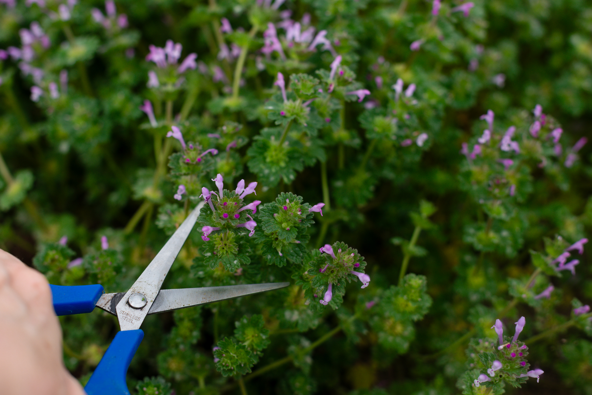 The first harvest of the year is one I didn’t even plant. Not long ago the purple blossoms began to pop up and soon spread all over the empty garden beds, pathways, and across the lawn. My gardening group said it was henbit, a first food for pollinators. We were told it would give the bees a head start and eventually wither back, so I left it alone and enjoyed the view. Then my herbalism and foraging group mentioned “getting the henbit in” and I was intrigued.