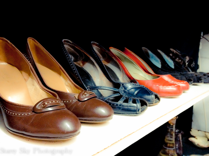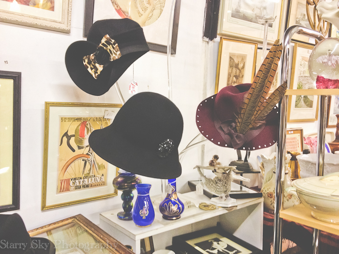I was thrilled to find racks of vintage clothing and shoes and took notes for the girls, whom I have promised to return with.  The hats were in mint condition – felted wool creations molded into exquisite shapes, sporting feathers and ribbon trim still in excellent condition.